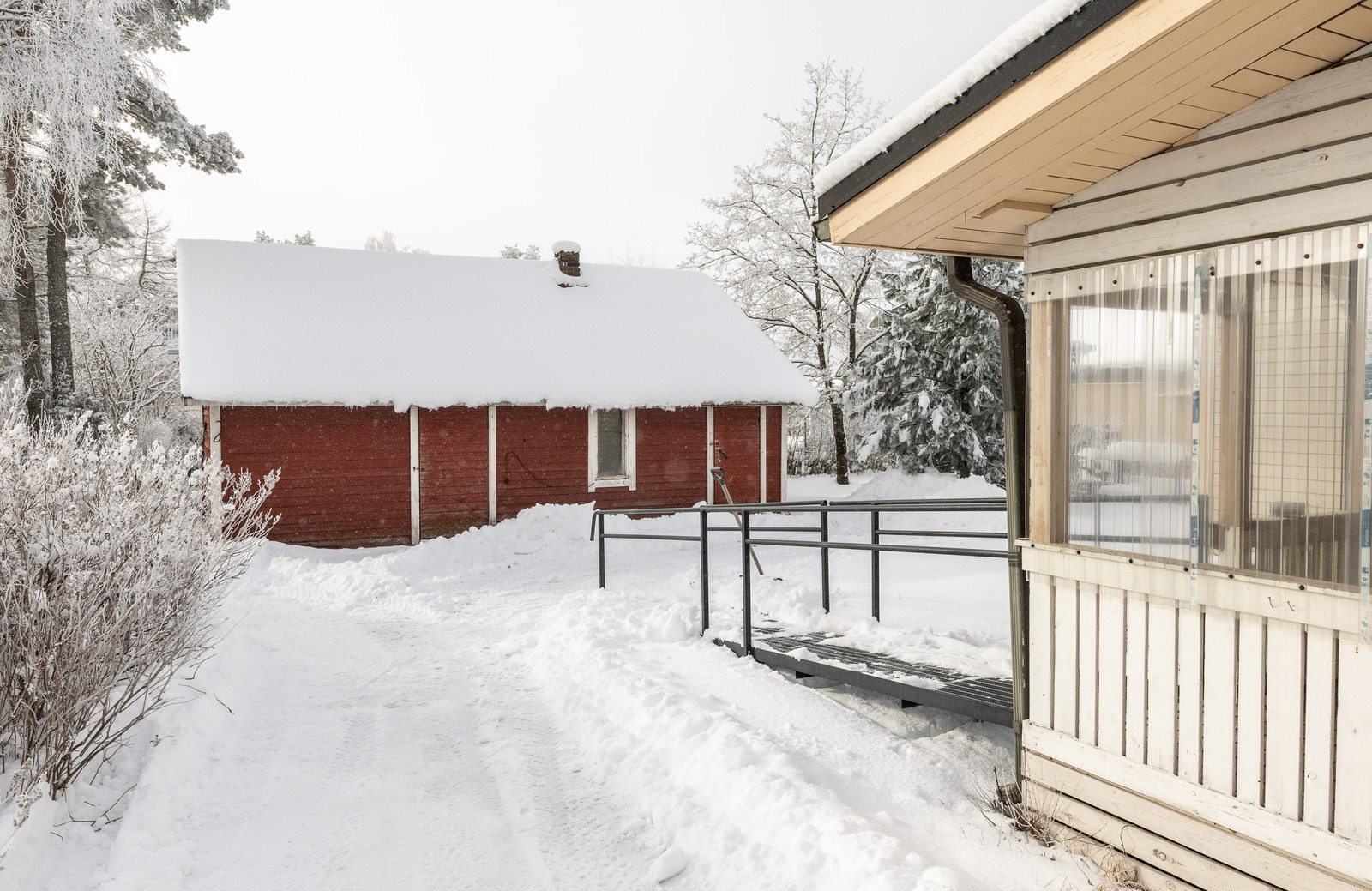 Pihan perällä vanha ulkorakennus jossa on sauna ja varastotiloja.