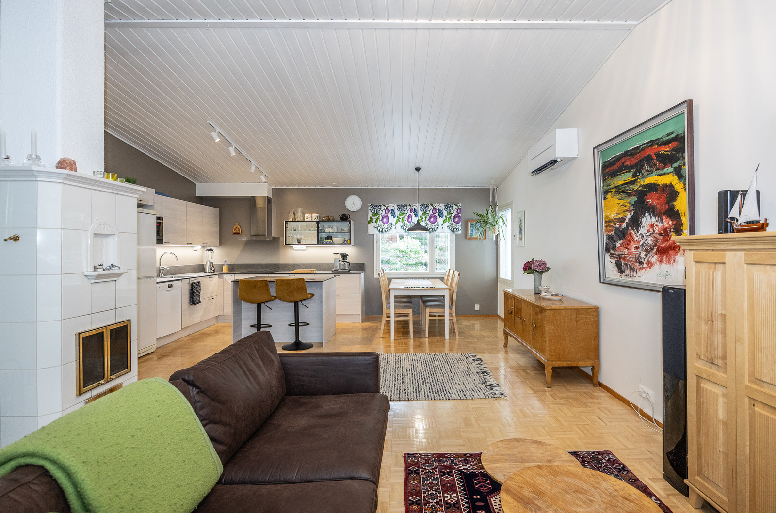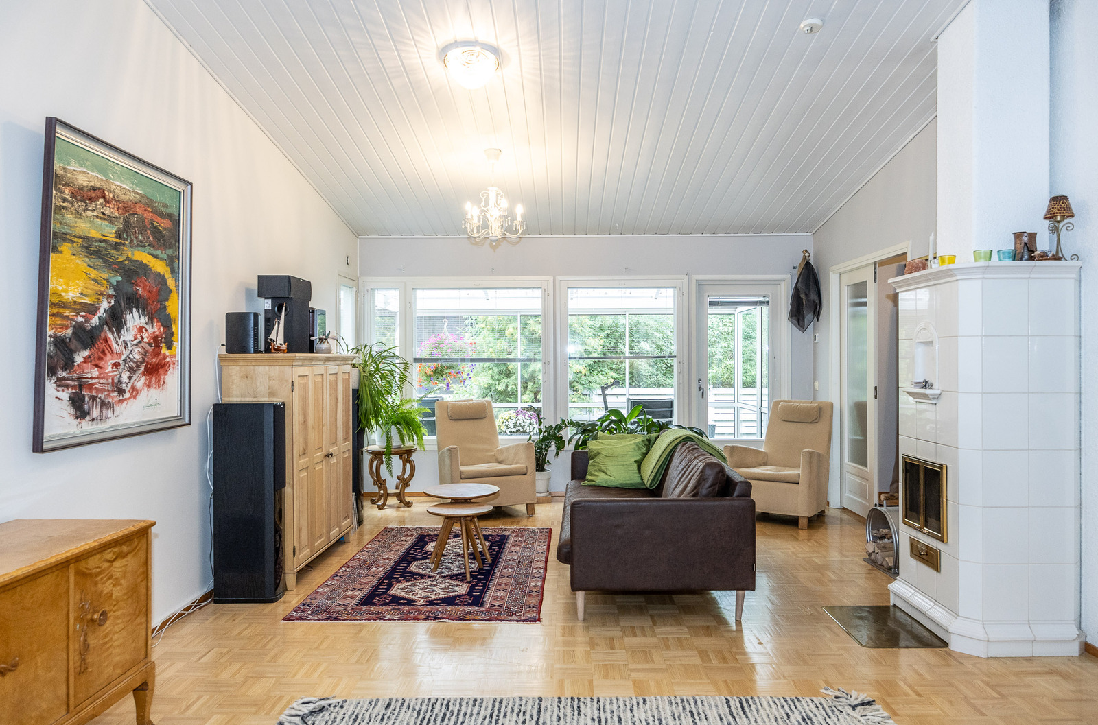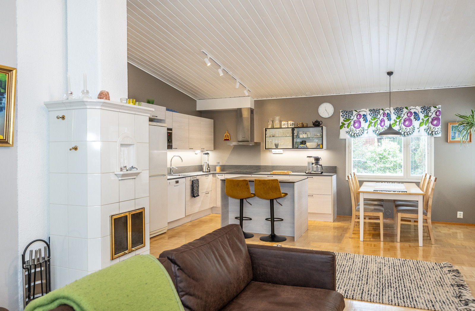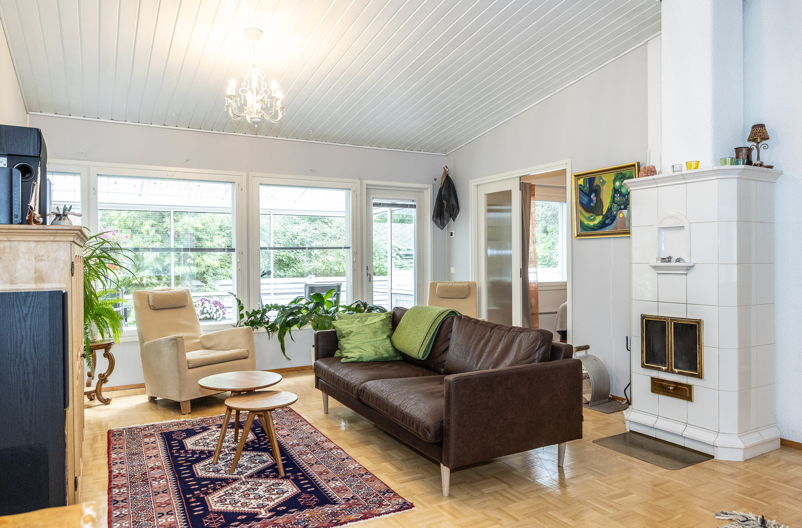 Keittiö, ruokailutila ja olohuone, ovat avaraa, yhtenäistä valoisaa tilaa. Tilantuntua lisää korotettu sisäkatto. Olohuoneesta on kulku takapihan viihtyisälle, lasitetulle terasille jonka jatkeena avoterassi.