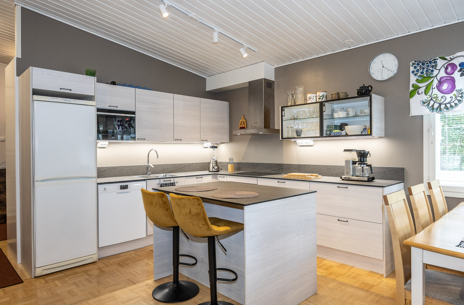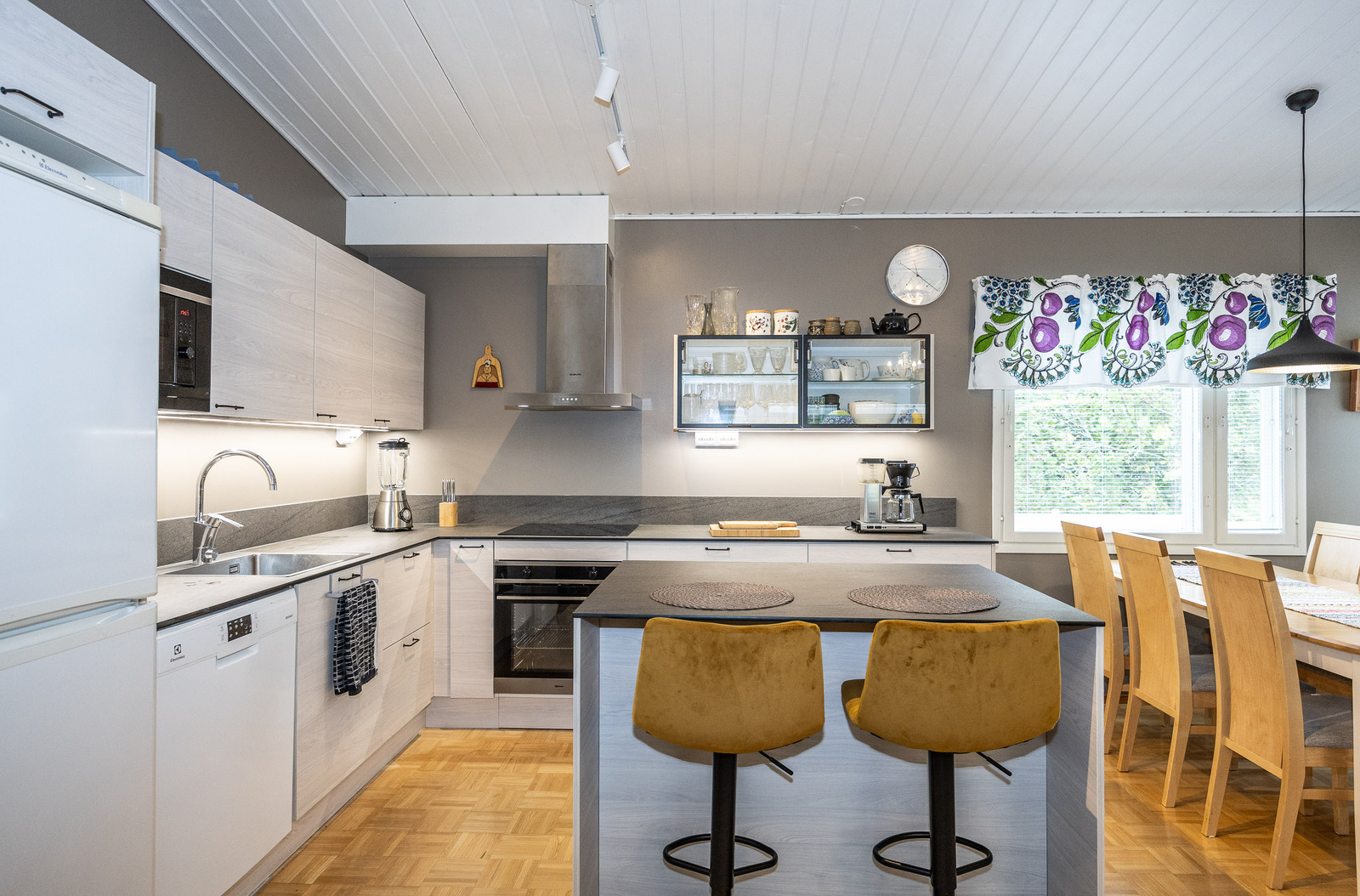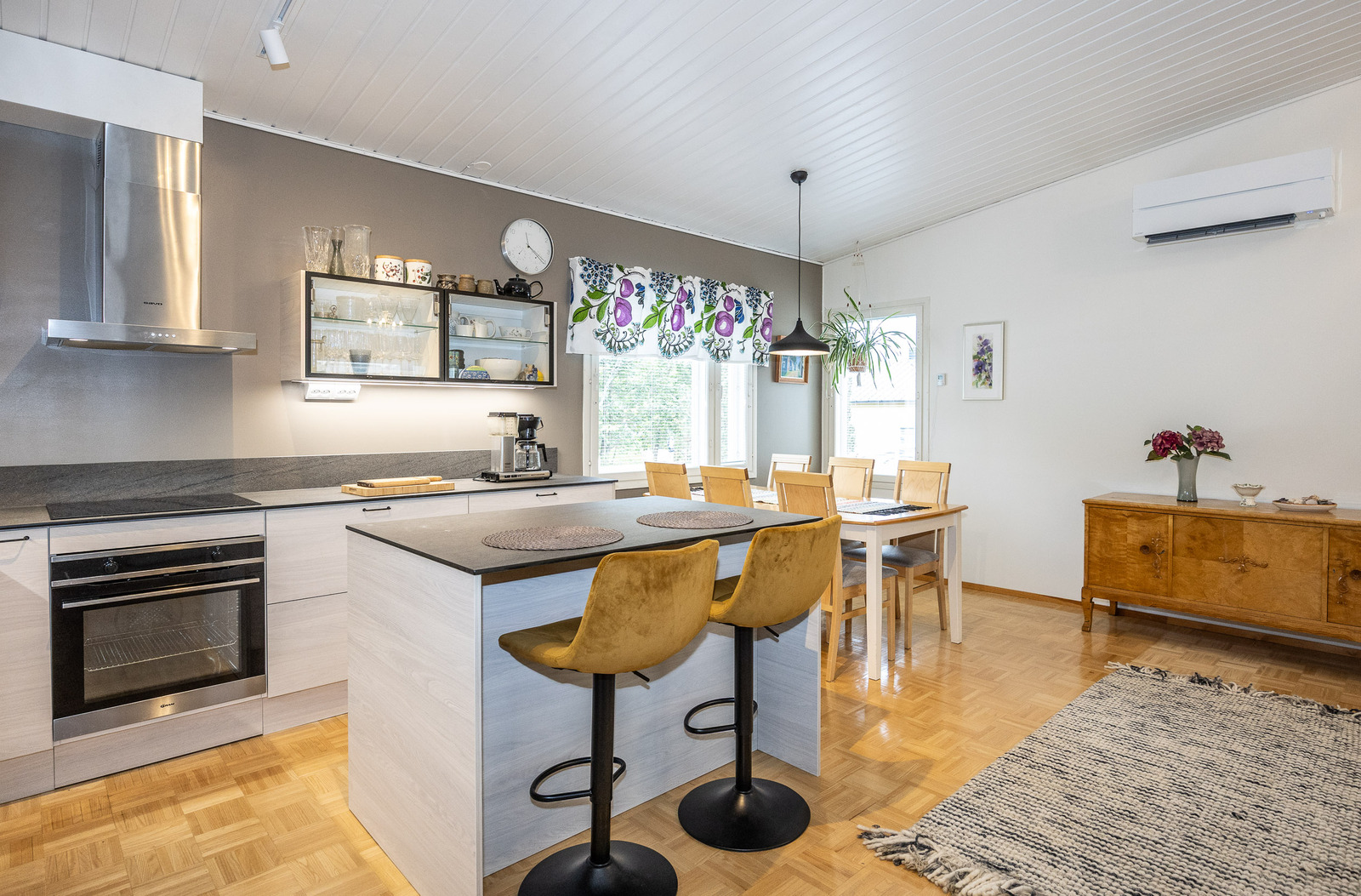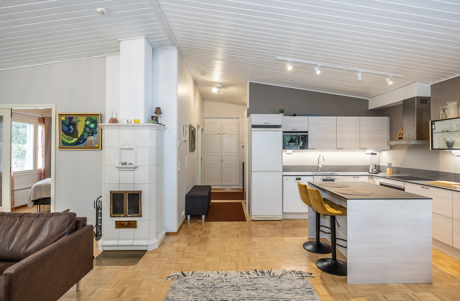Keittiö, ruokailutila ja olohuone, ovat avaraa, yhtenäistä valoisaa tilaa. Tilantuntua lisää korotettu sisäkatto. Olohuoneesta on kulku takapihan viihtyisälle, lasitetulle terasille jonka jatkeena avoterassi.