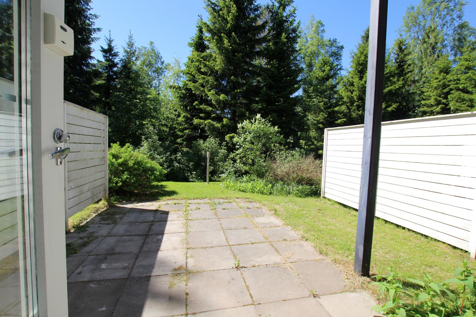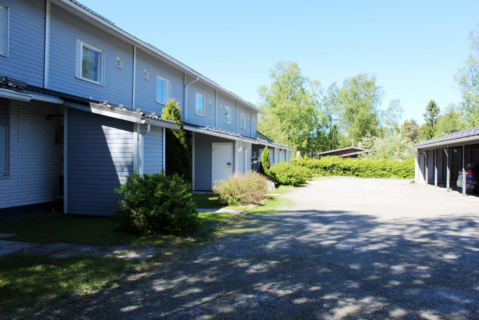 Viihtyisä taloyhtiön piha, autokatospaikka sekä ulkovarasto huoneiston etupihalla.