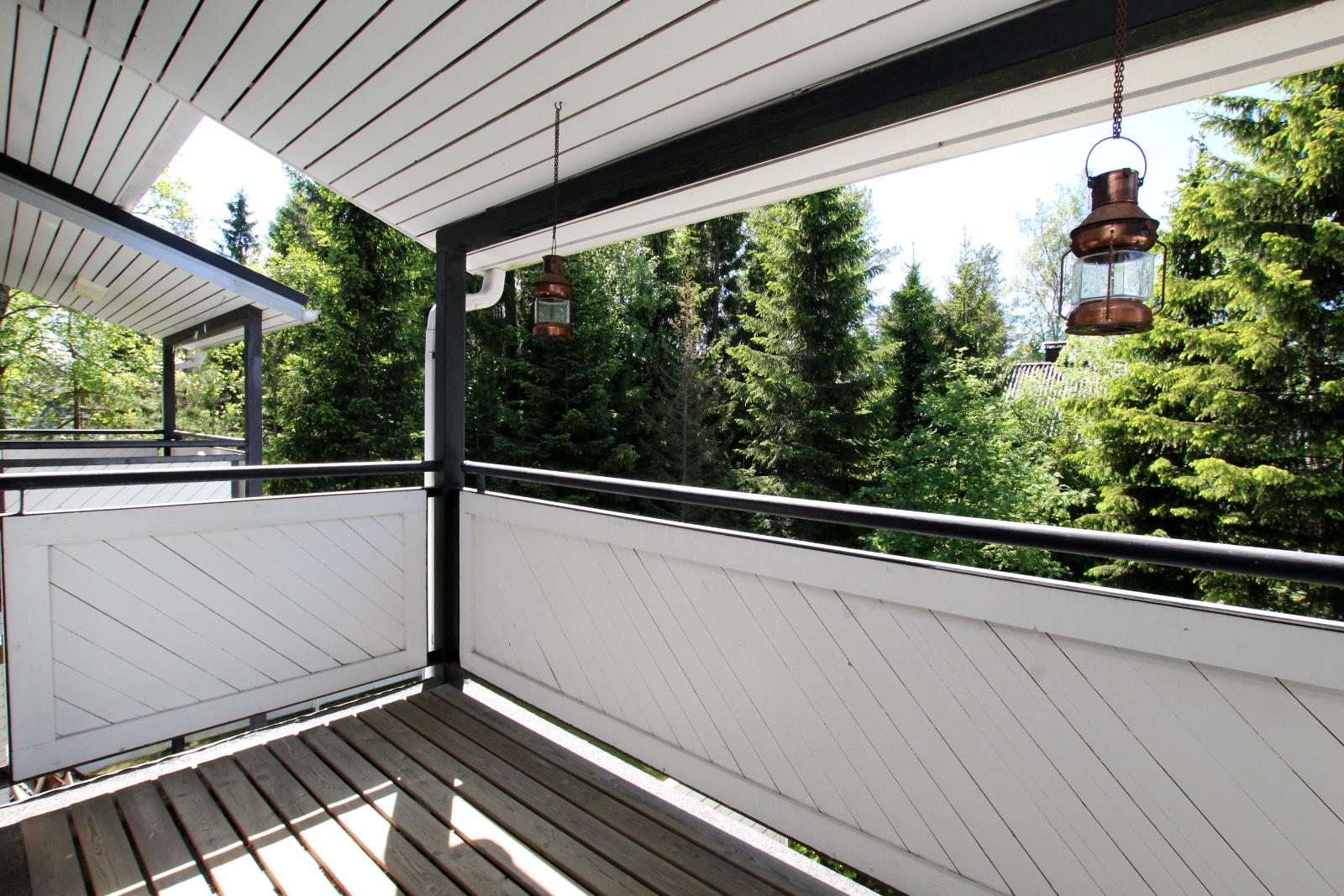 Ylhäällä hyvät makuuhuoneet sekä kylpyhuone- ja saunatilat. Aurinkoinen terassi sekä parveke joista maisemat vihreään metsikköön. Huoneistossa varaava takka ja ilmalämpöpumppu.
