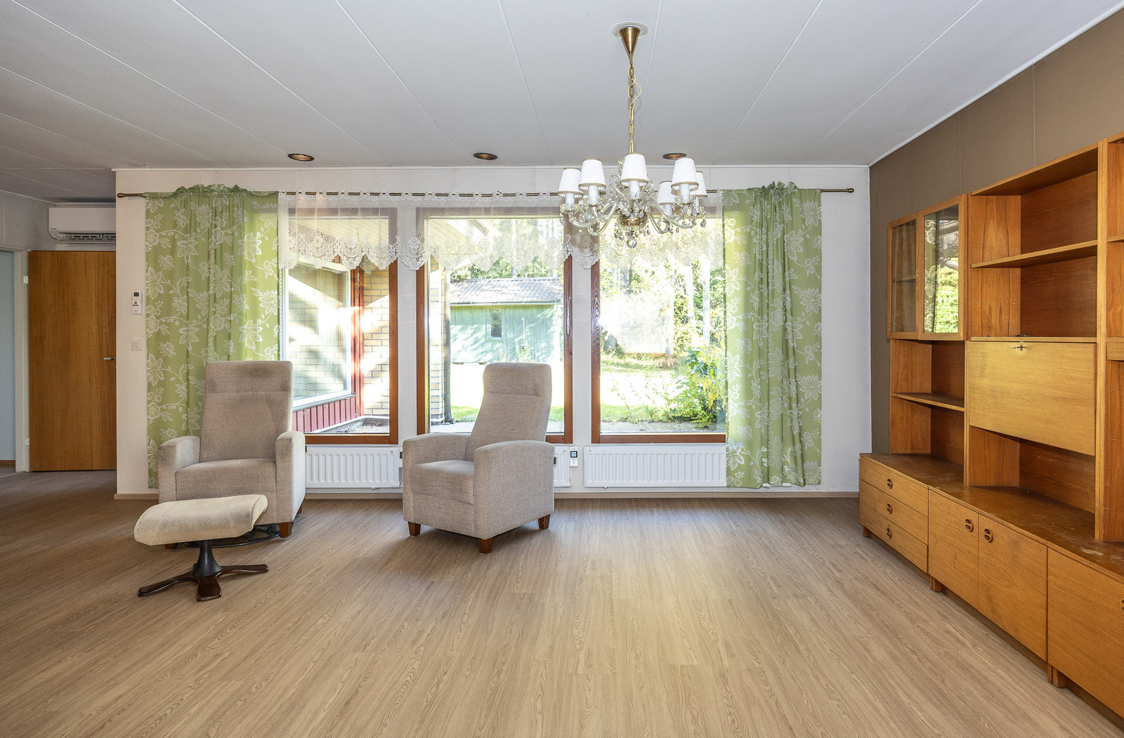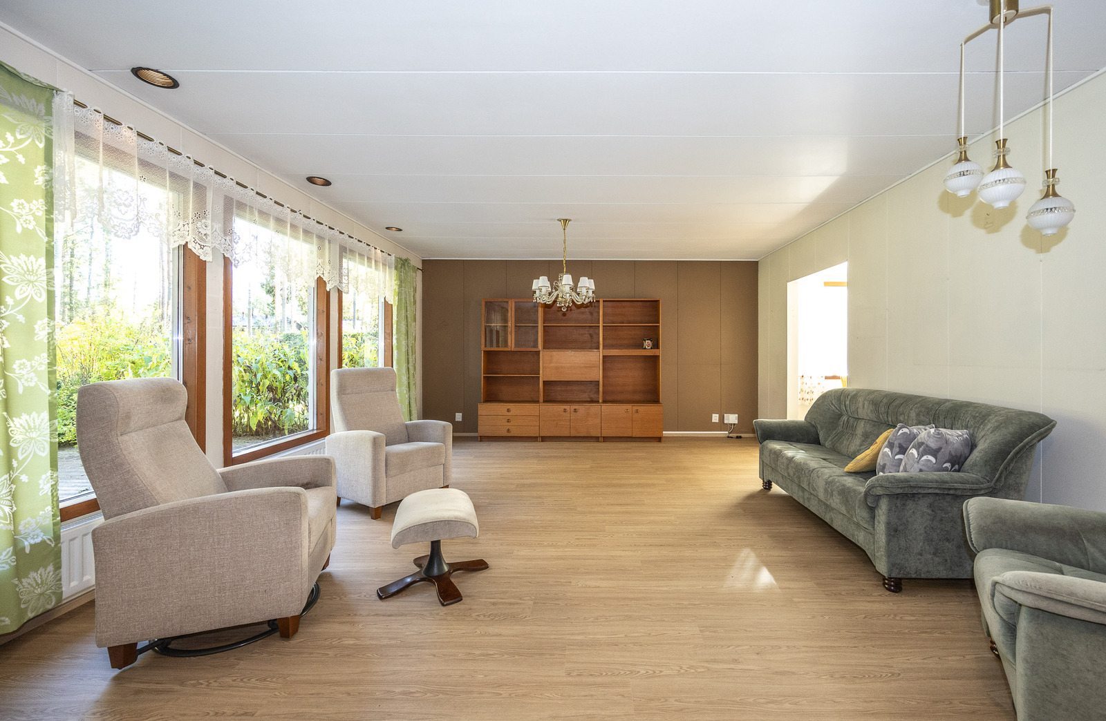 Tilat ja huoneet ovat kaikki tilavia ja talo huokuu upeaa 1970-luvun henkeä isoine ikkunoineen.