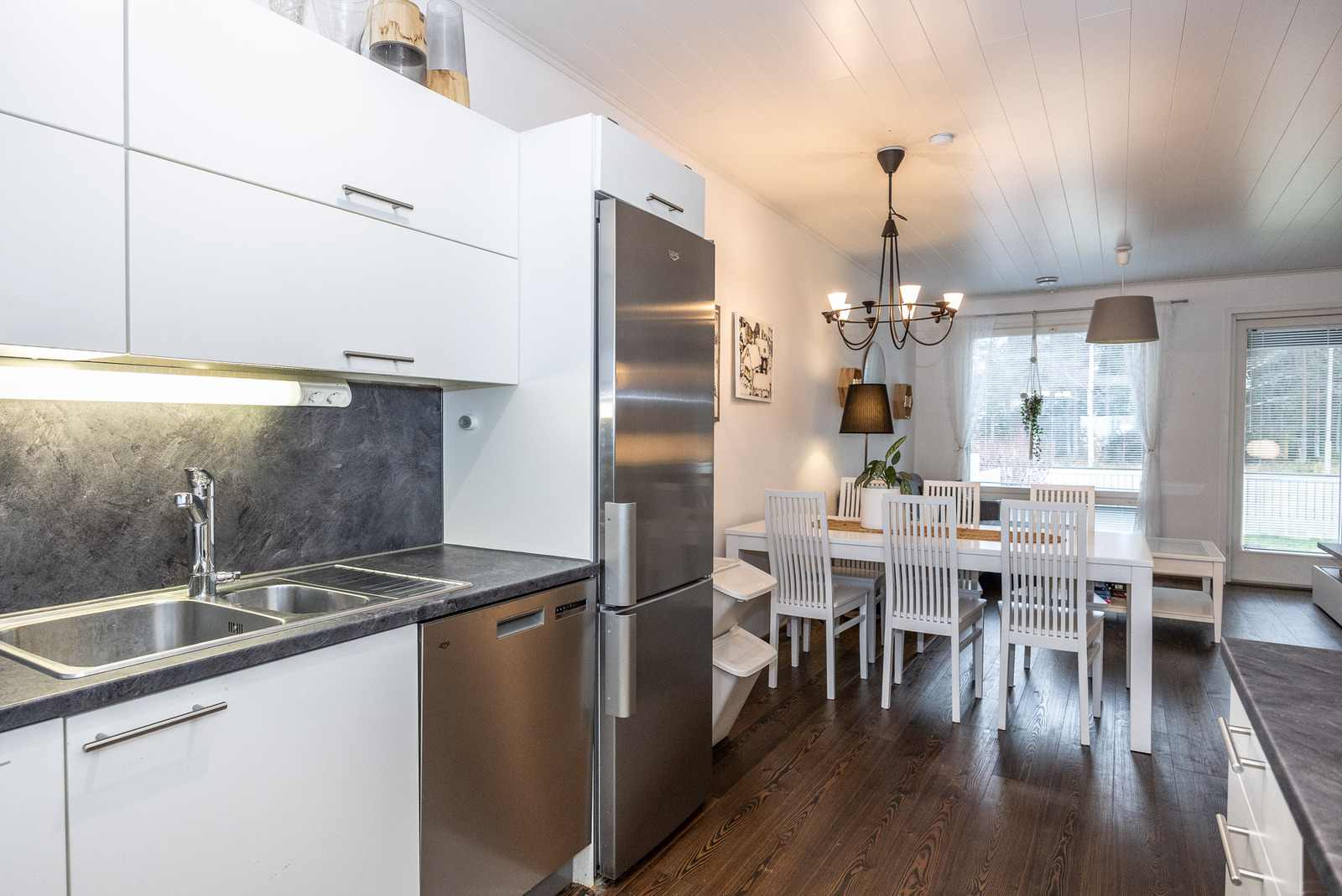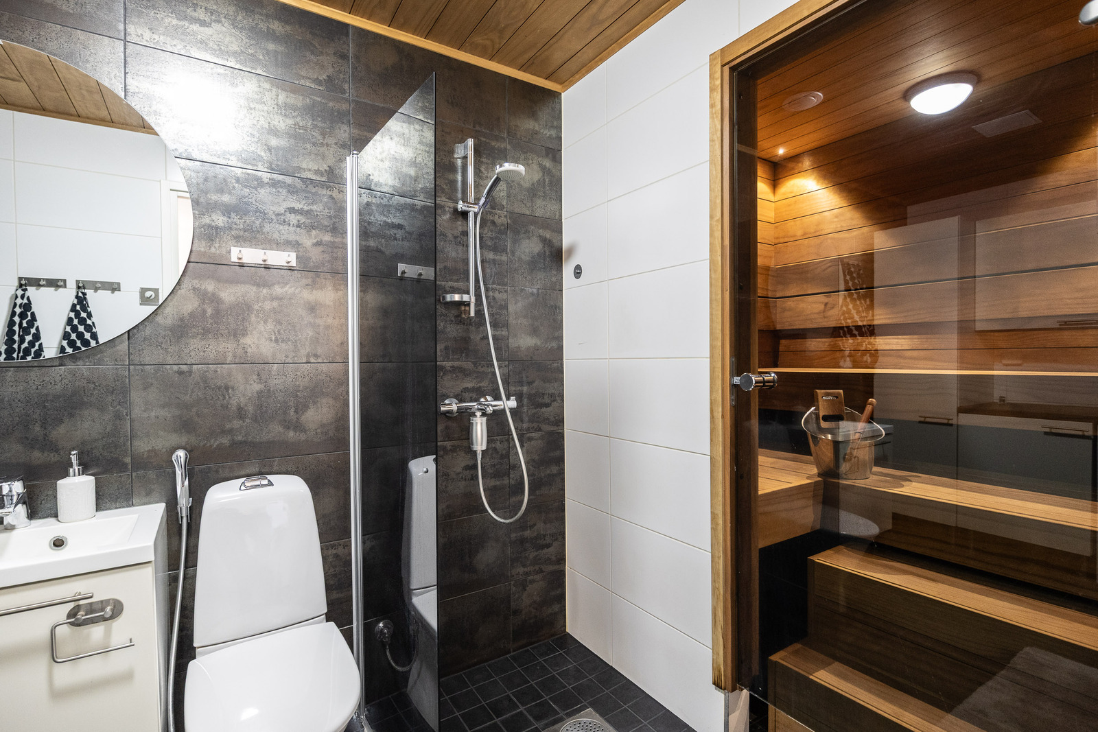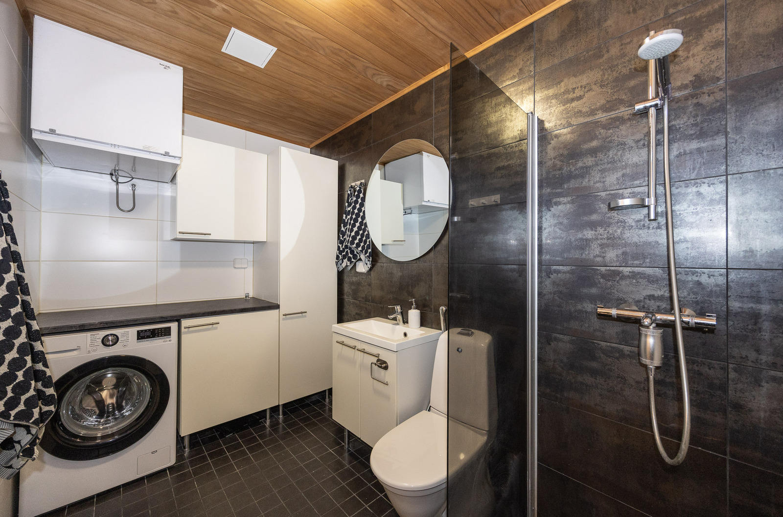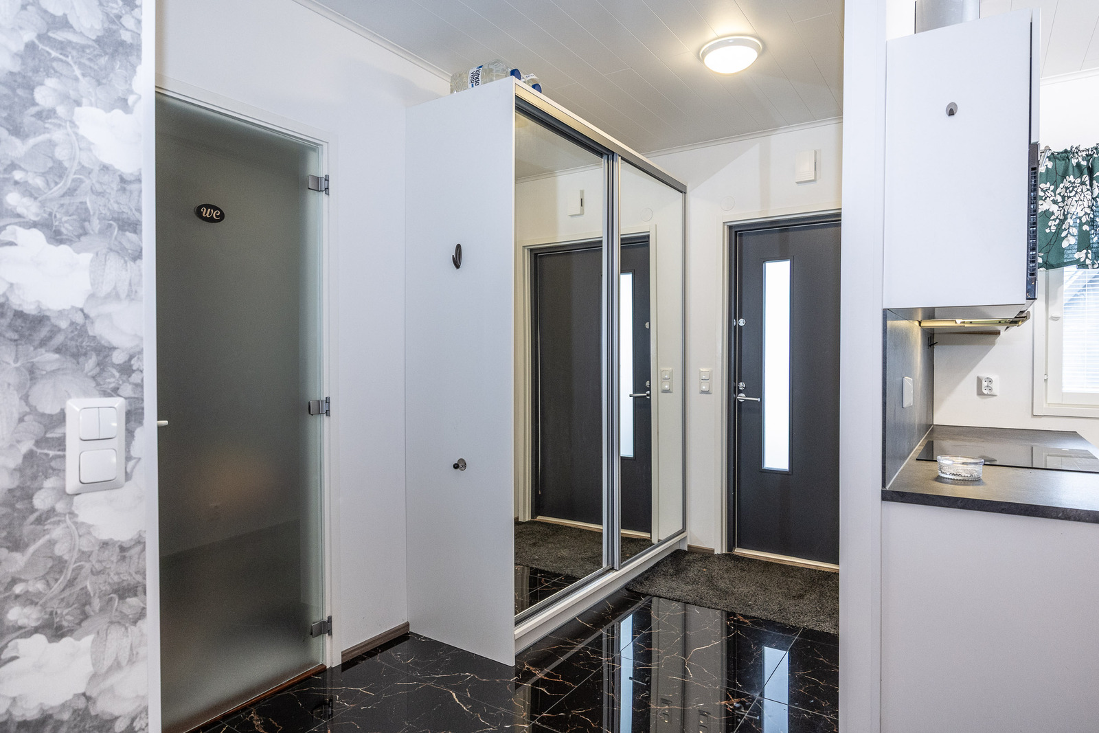 Keittiössä on tyylikkäät ja käytännölliset kippiovelliset kaapistot, sekä hyvin laskutilaa. Eteisessä on näyttävä marmoripinnoitettu laatta. Tyylikäs kylpyhuone on tehokas yksikkö, jossa hoituu myös kodin tekstiilihuolto. Saunassa hienot mäntylauteet ja -seinät.