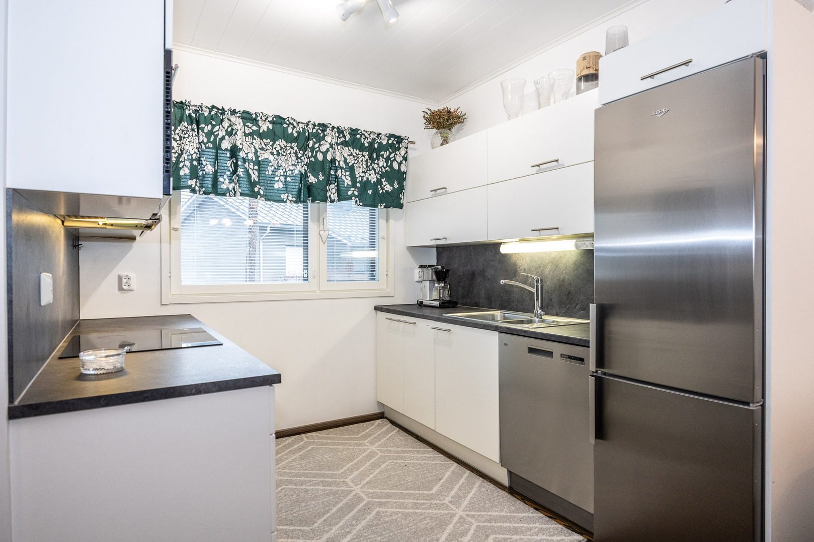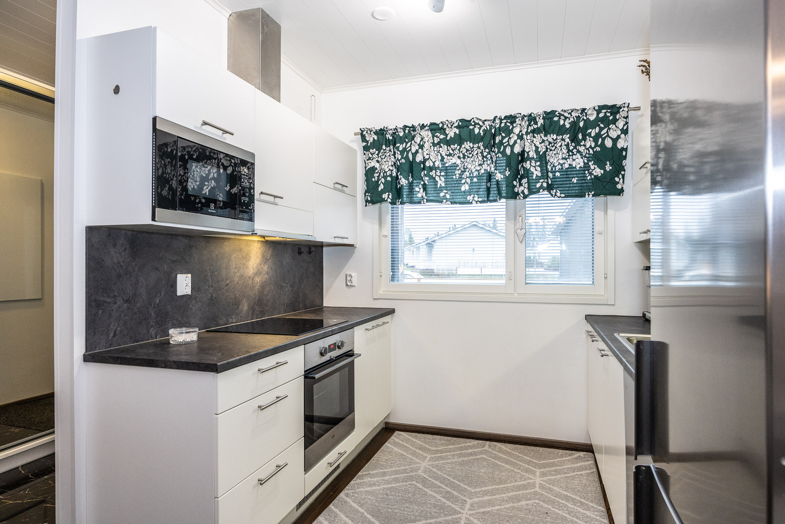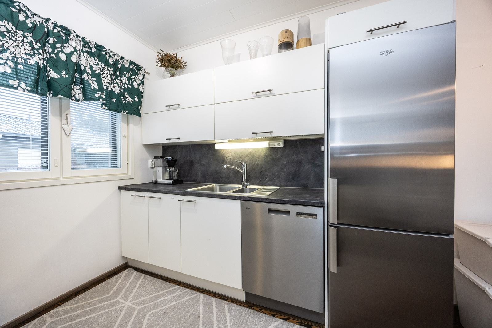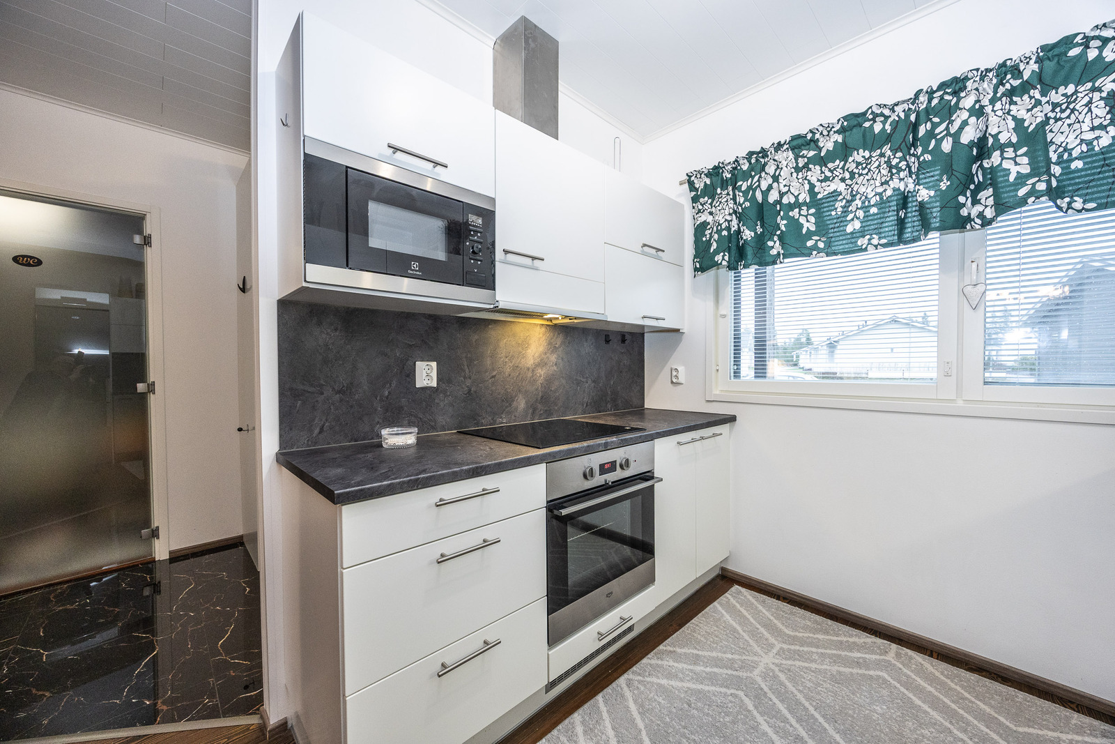 Keittiössä on tyylikkäät ja käytännölliset kippiovelliset kaapistot, sekä hyvin laskutilaa. Eteisessä on näyttävä marmoripinnoitettu laatta. Tyylikäs kylpyhuone on tehokas yksikkö, jossa hoituu myös kodin tekstiilihuolto. Saunassa hienot mäntylauteet ja -seinät.