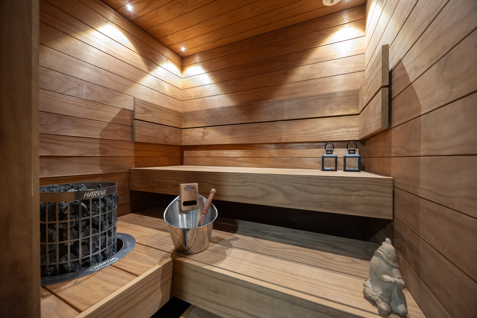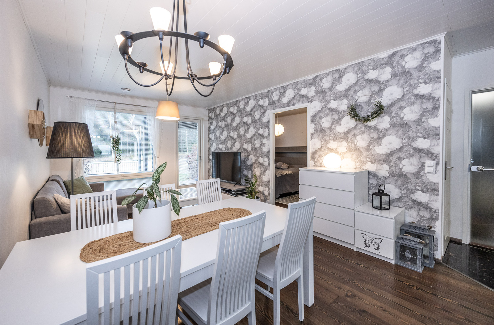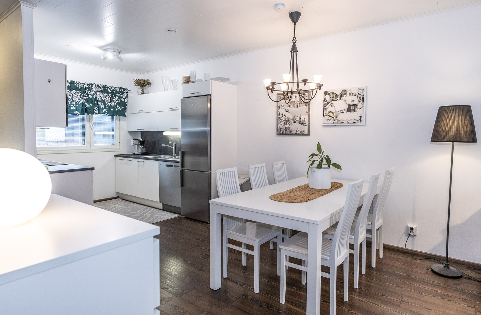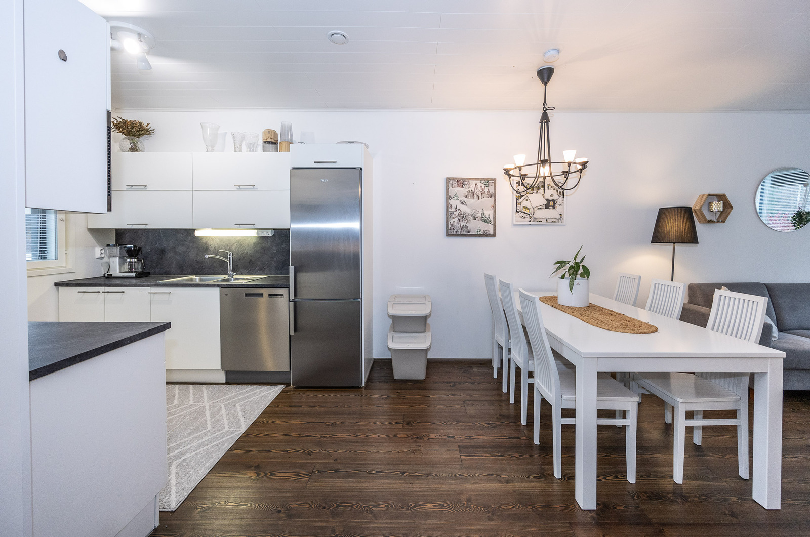 Keittiössä on tyylikkäät ja käytännölliset kippiovelliset kaapistot, sekä hyvin laskutilaa. Eteisessä on näyttävä marmoripinnoitettu laatta. Tyylikäs kylpyhuone on tehokas yksikkö, jossa hoituu myös kodin tekstiilihuolto. Saunassa hienot mäntylauteet ja -seinät.
