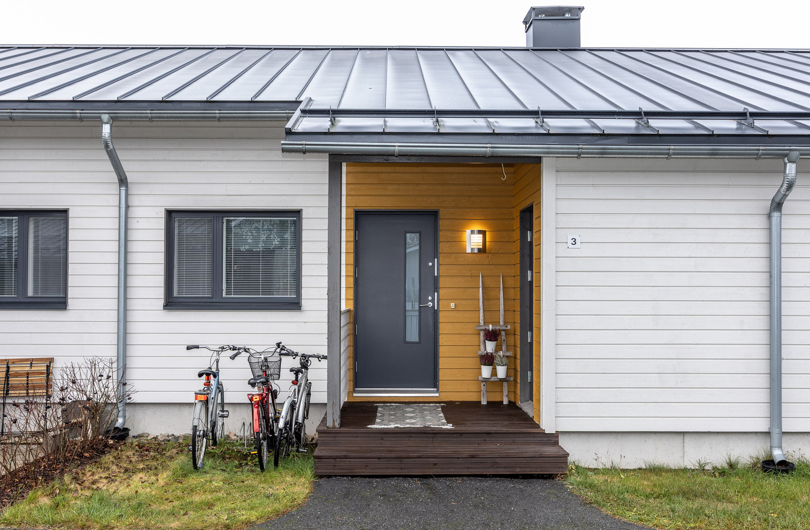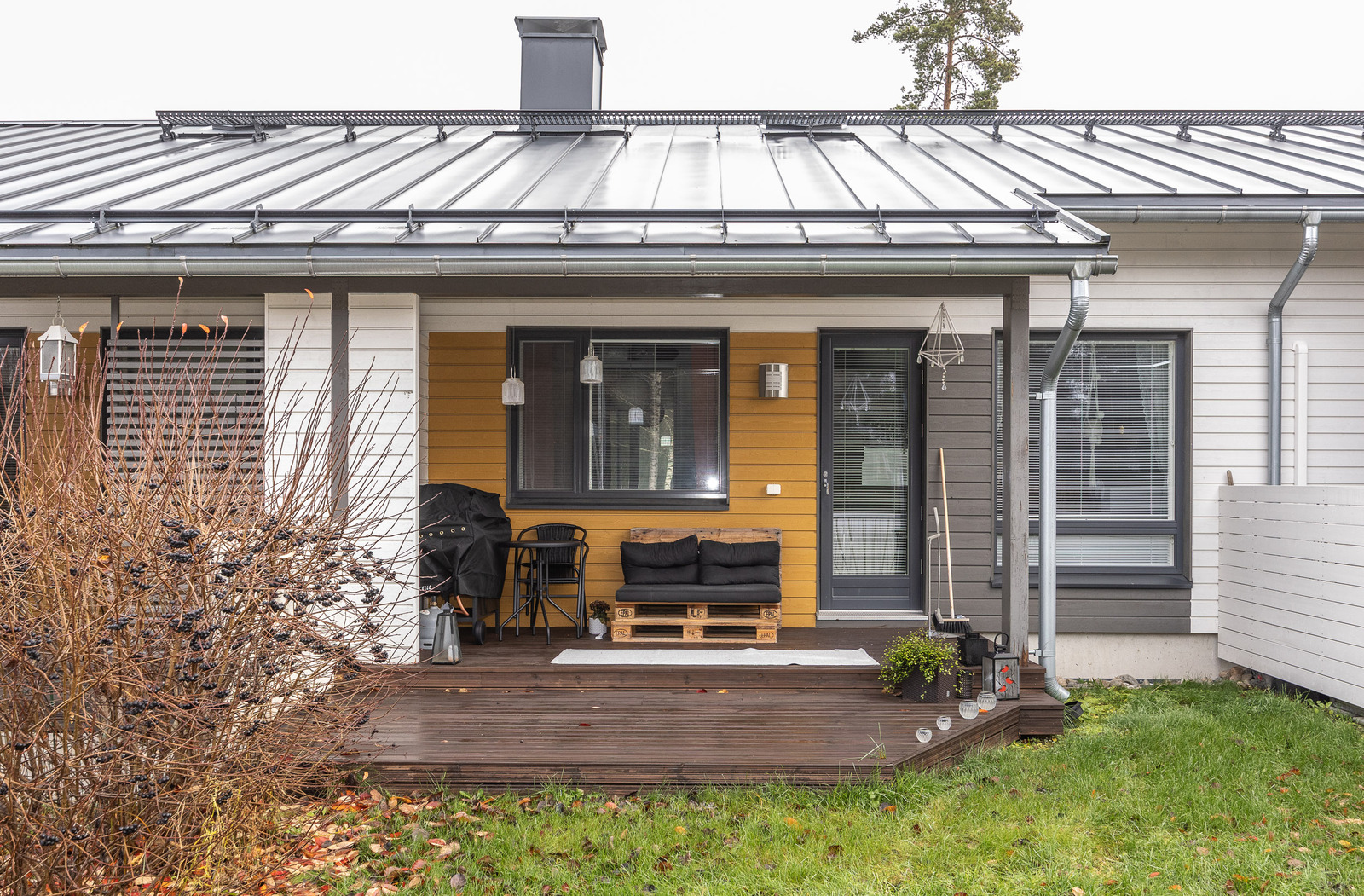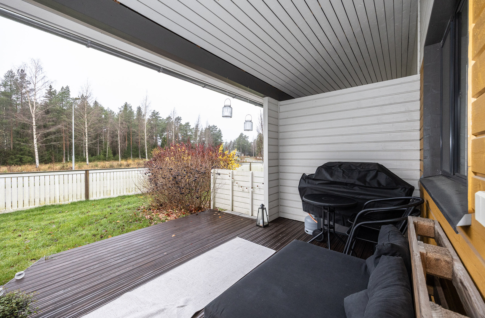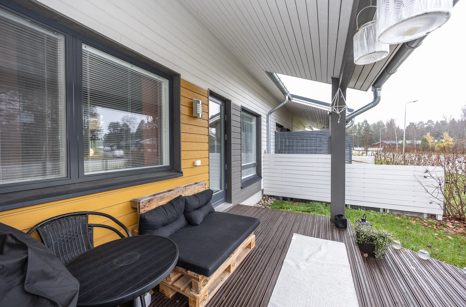 Oma varasto on sisäänkäynnin yhteydessä. Aurinkoisella takapihalla on kookas osittain katettu terassi sekä oma nurmikkoalue.