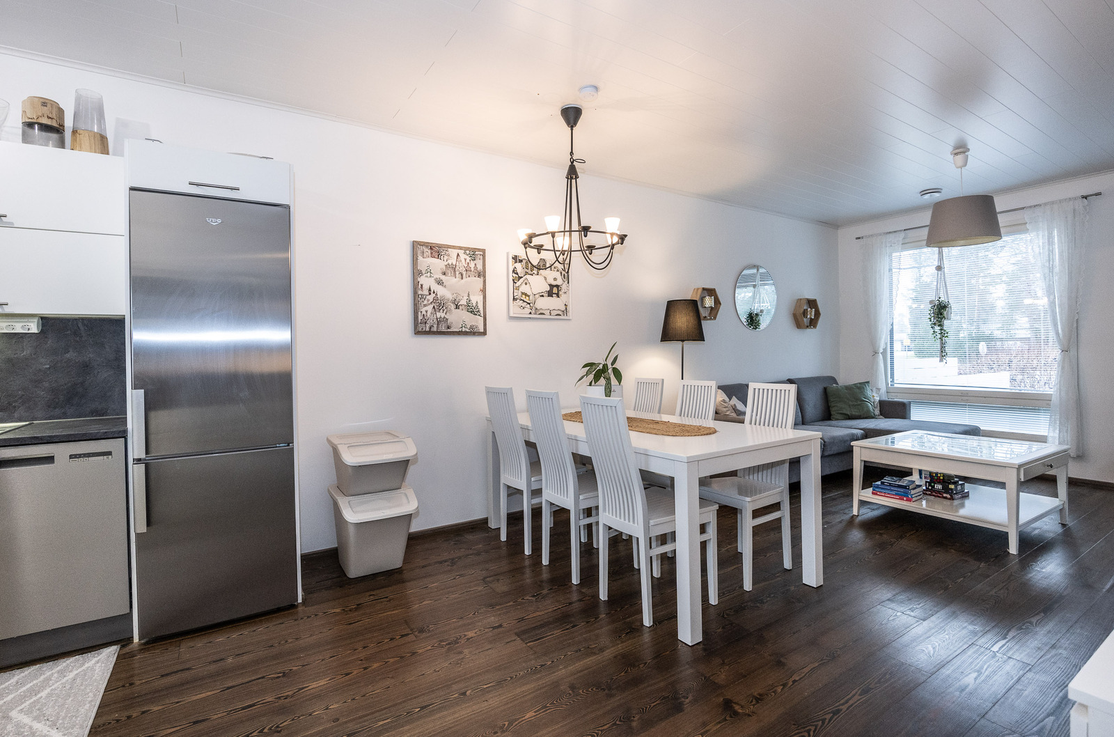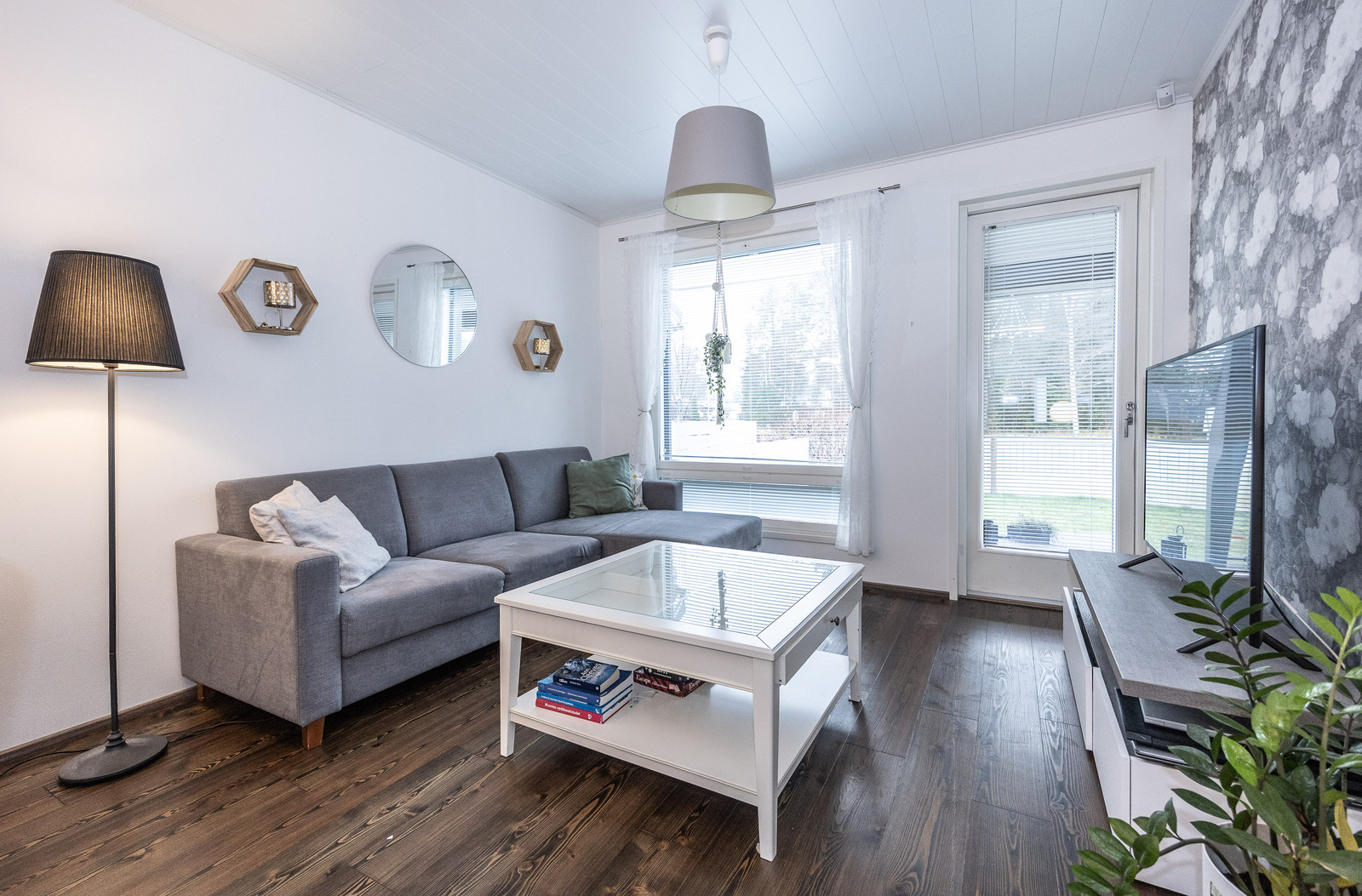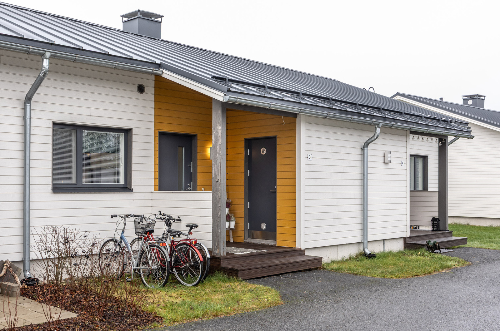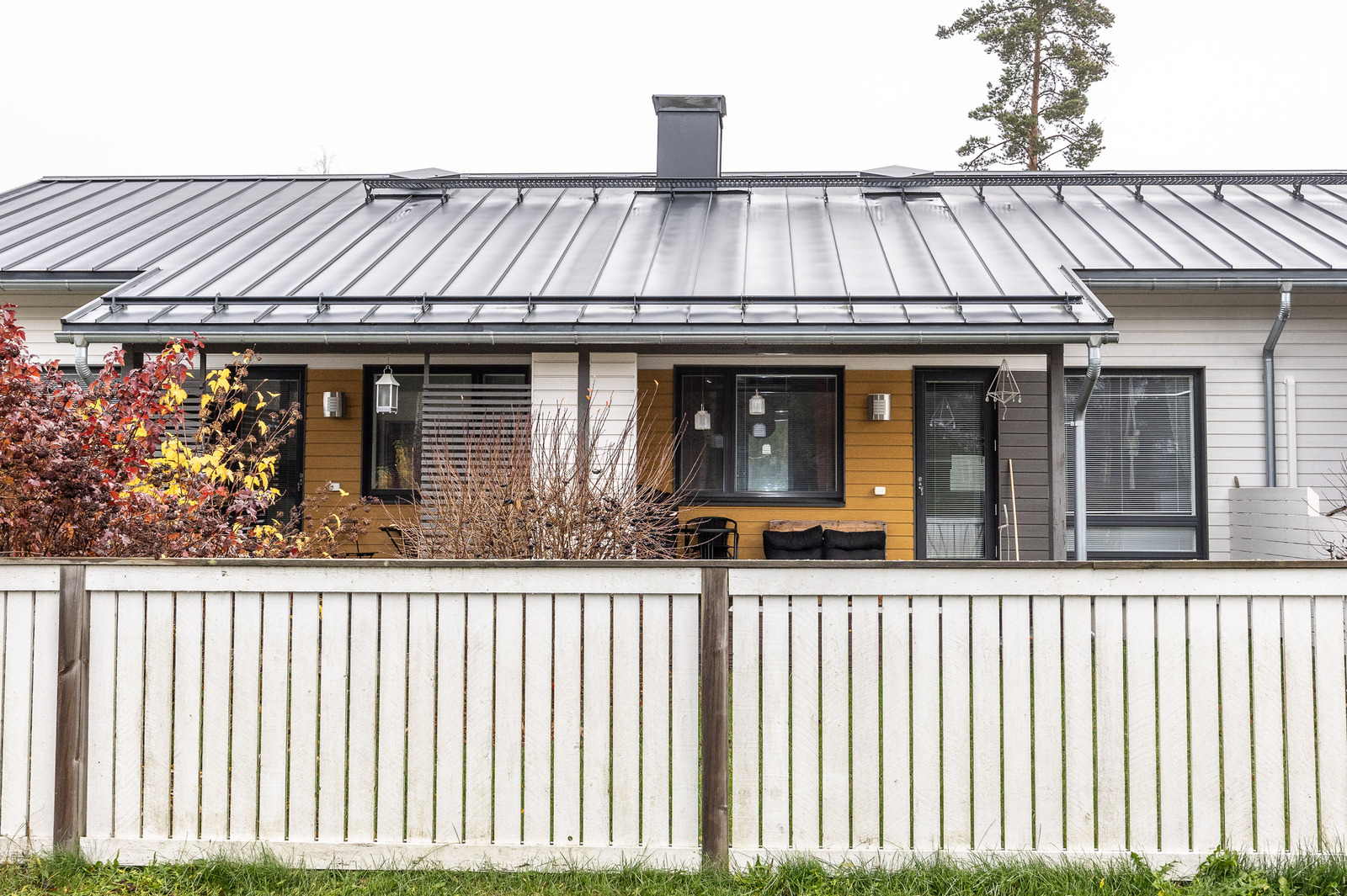 Oma varasto on sisäänkäynnin yhteydessä. Aurinkoisella takapihalla on kookas osittain katettu terassi sekä oma nurmikkoalue.