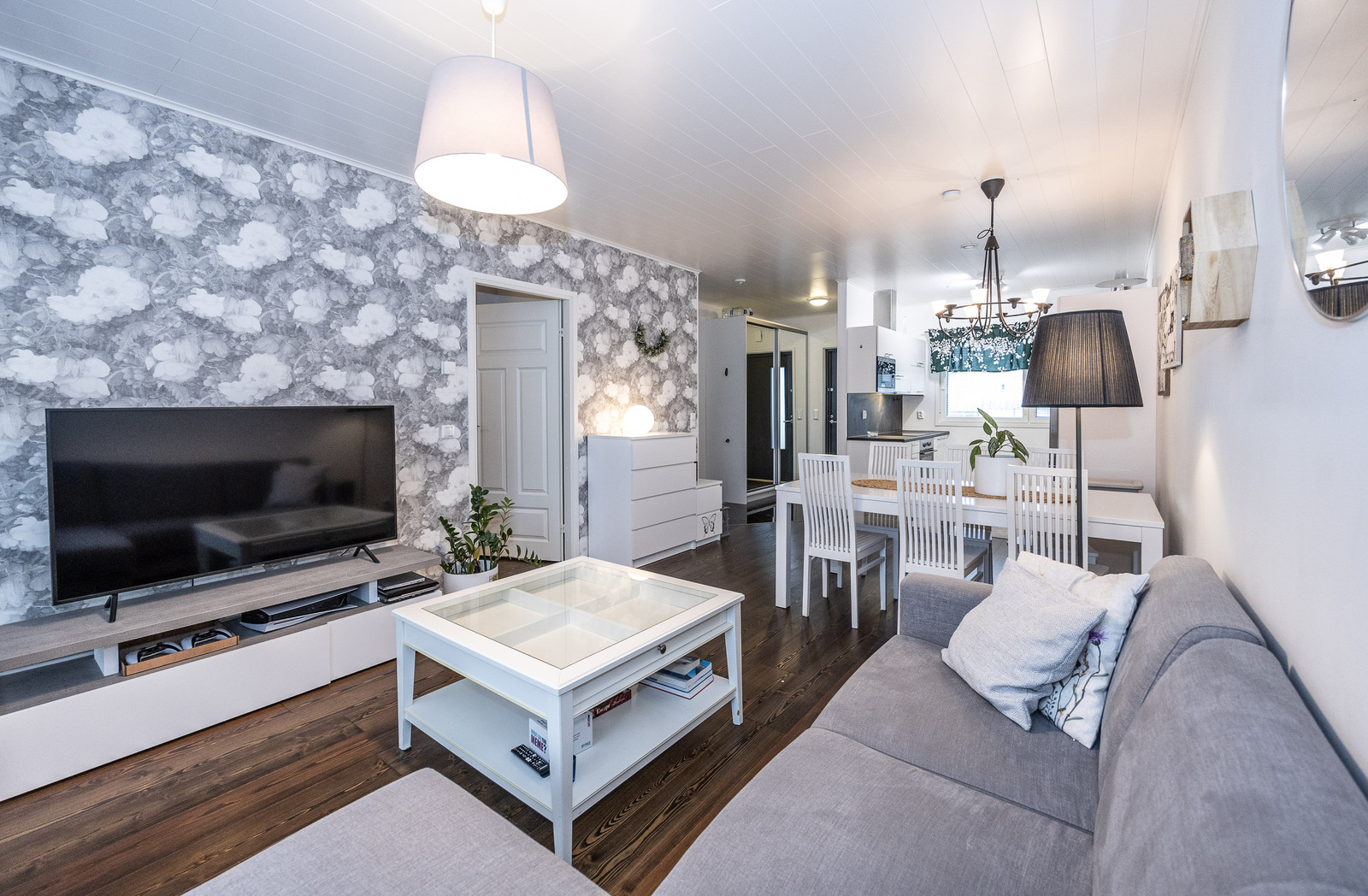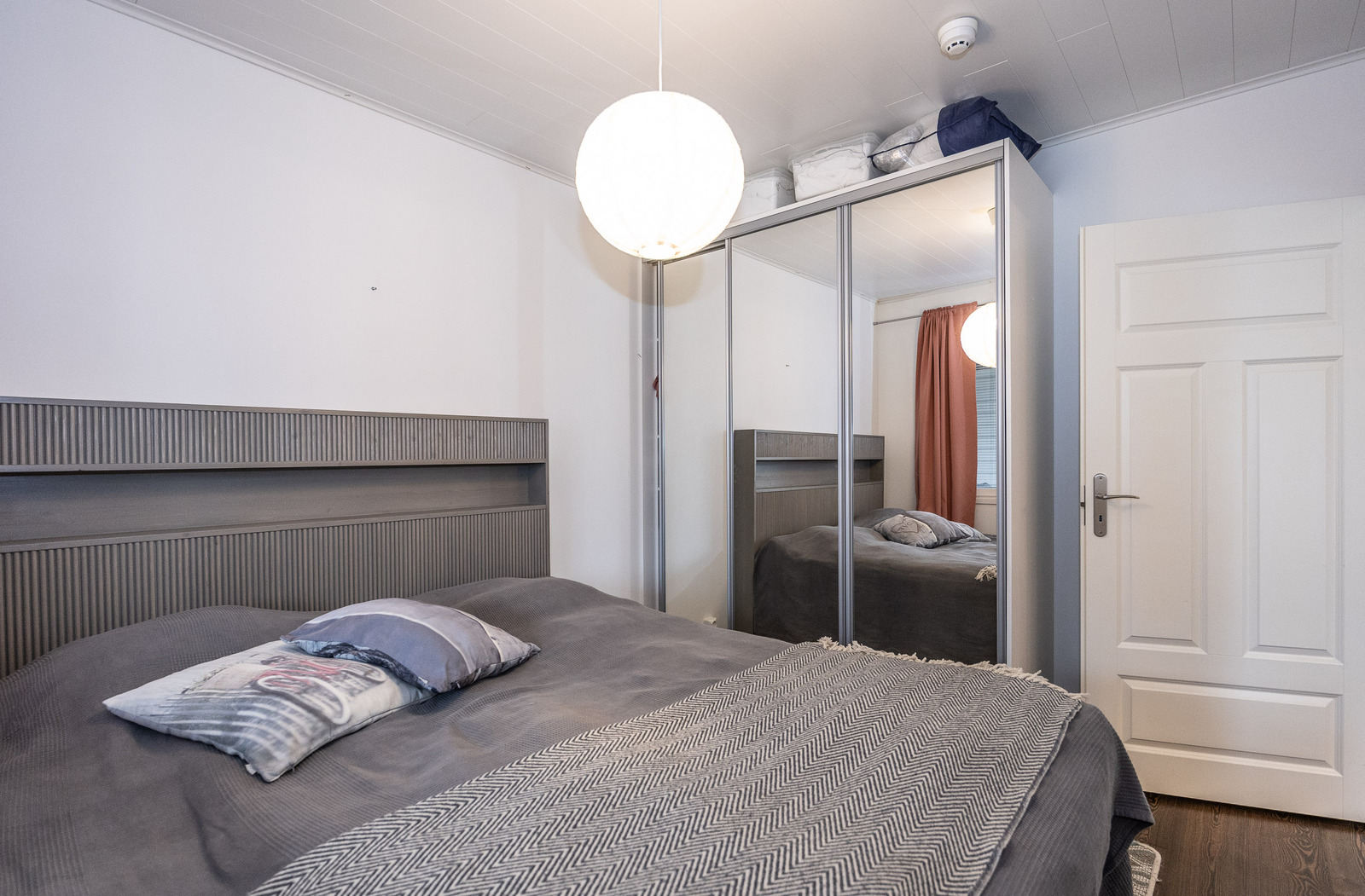 Tässä kodissa on hyvin säilytystilaa; liukuovelliset kaapistot makuuhuoneessa ja eteisessä, sekä vaatehuone. Huoneiston laadukas öljyvahattu lehtikuusiparketti on kuin piste iin päälle!